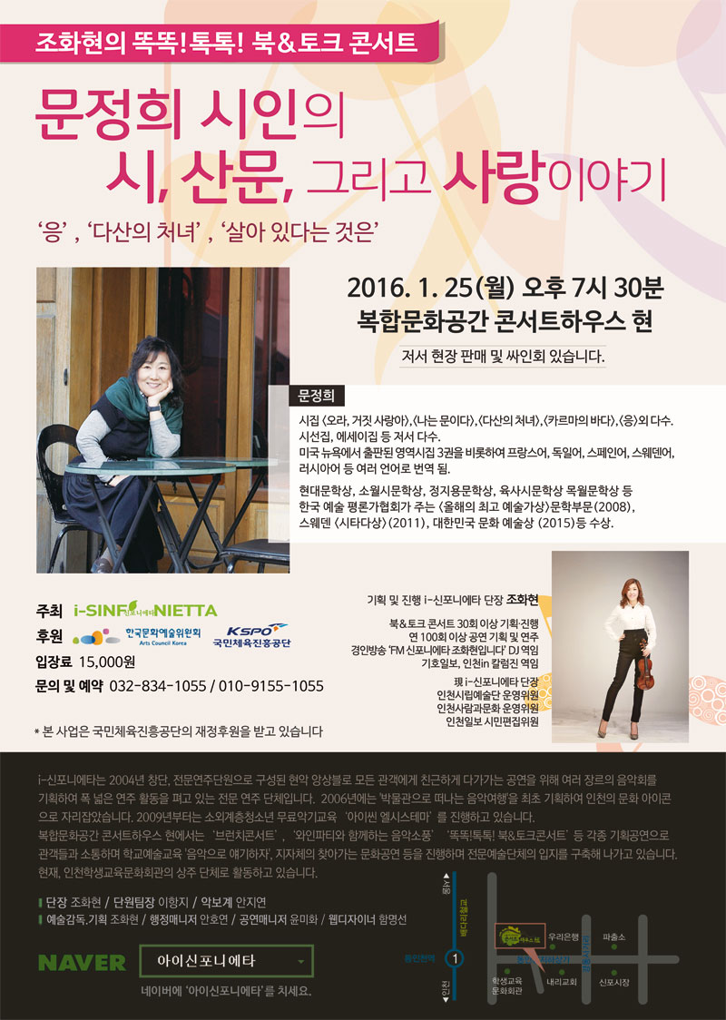 25일(월)오후 7시30분 인천에서 문정희 시인의 북&토크 콘서트가 있어요~